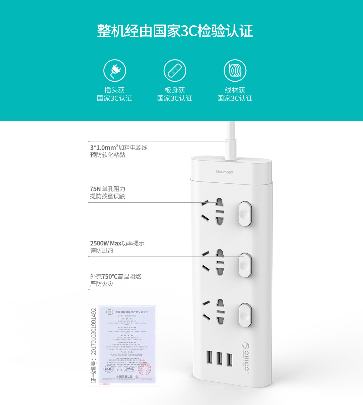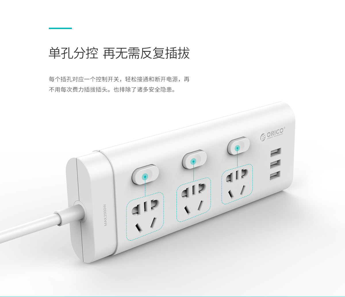 新國標3AC口分控式+3USB口智能排插