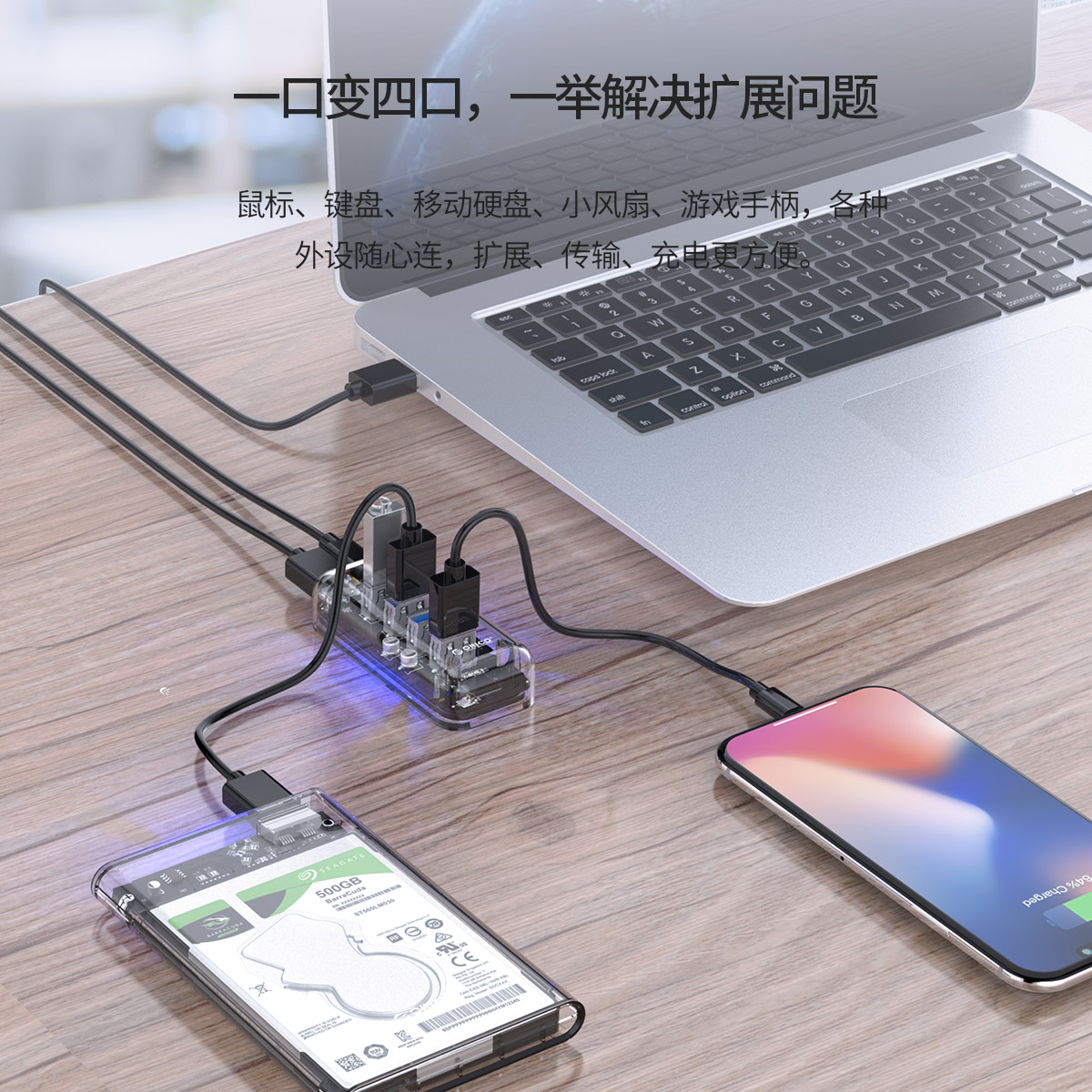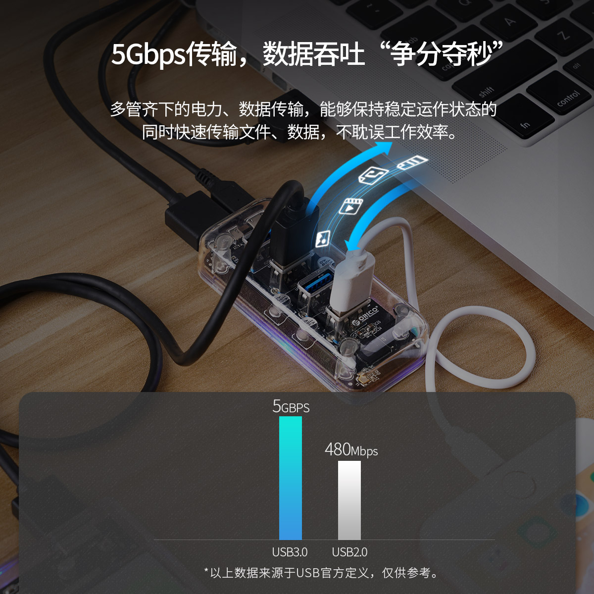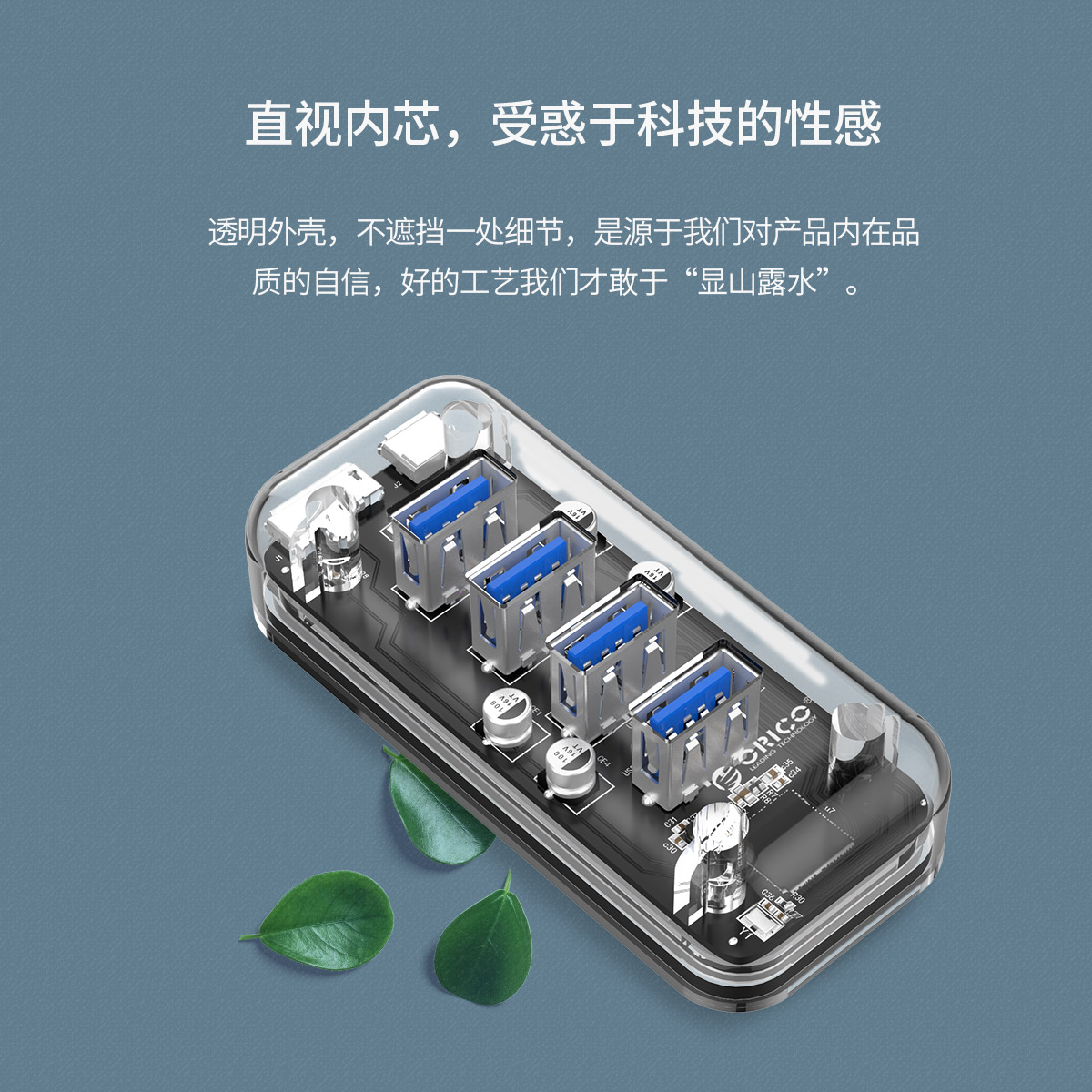 4口USB3.0透明桌面集線器,雙接口供電