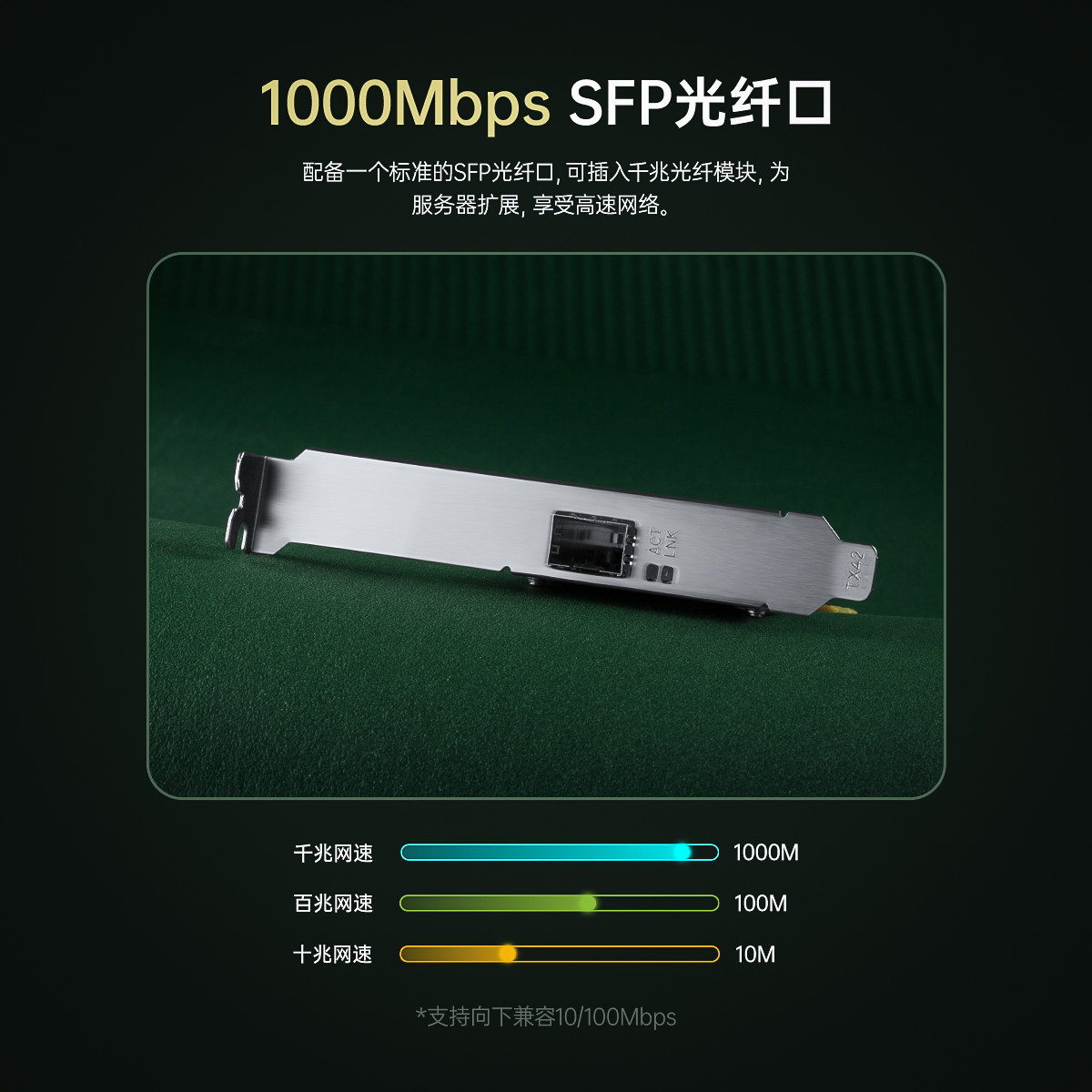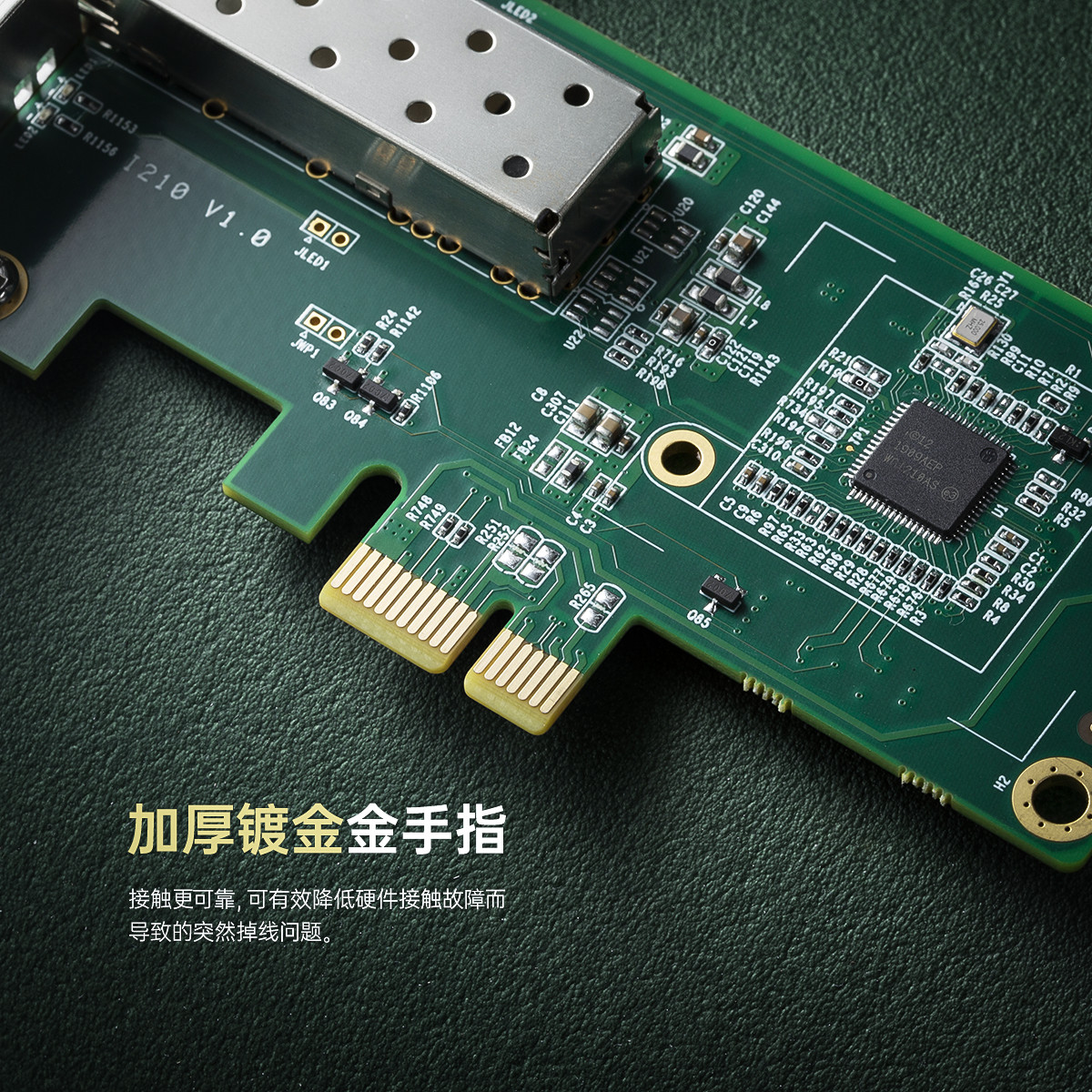 PCl-E插槽│強勁散熱|高速穩定,配備一個標準的SFP光纖口,可插入千兆光纖模塊,采用Intel 1210芯片,更大程度上消除干擾