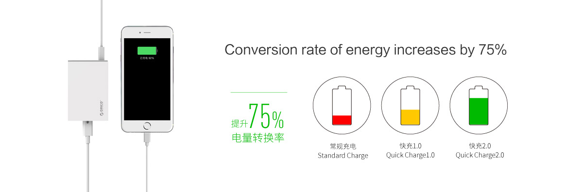 應急時刻,僅僅充電十分鐘,即可為您提供20%的續航,相比傳統充電器,充電速度提高了75%,30分鐘即可充至60%-75%的電量(以3000mAh的手機為例),QC2.0快速充電器大幅度減少你的充電等待時間。