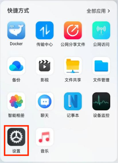 打開賽博云空間APP首頁,找到“快捷方式”-“全部應用”-“設置”項。