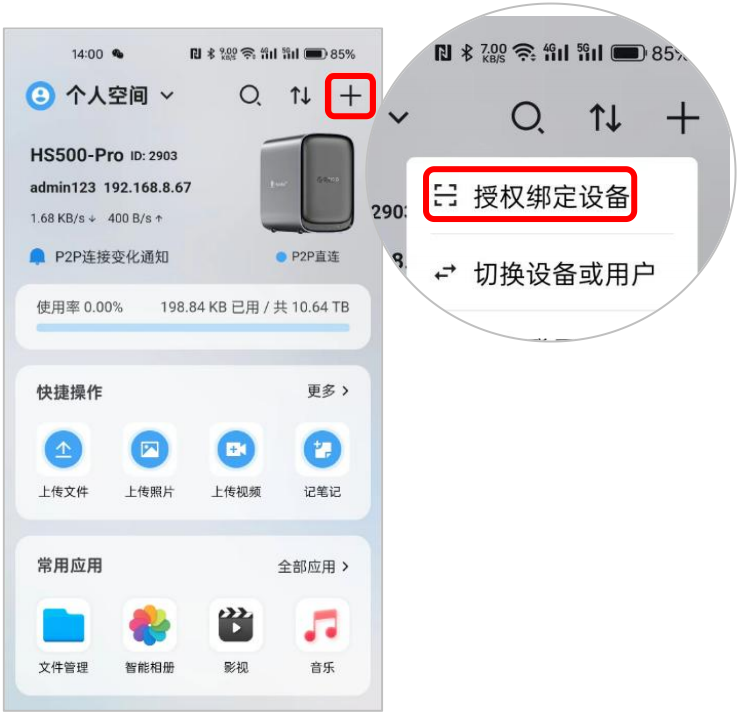 進入手機客戶端APP首頁,點擊右上角“+”圖標,再點擊“授權綁定設備”進行掃碼。